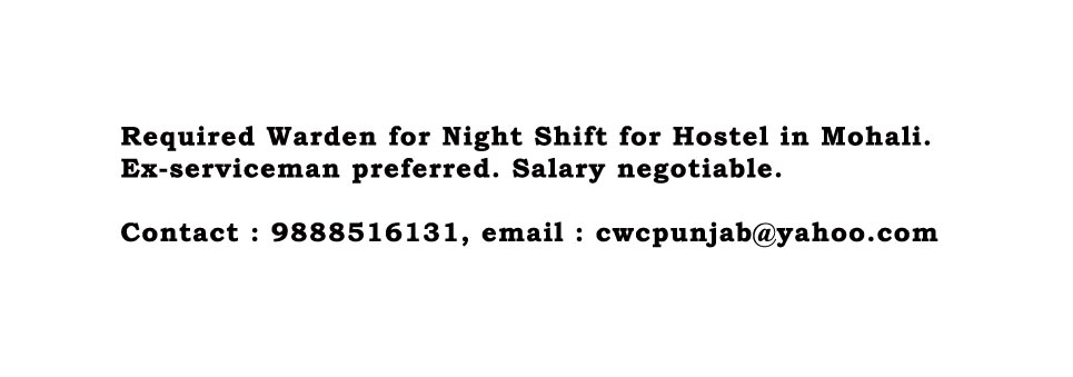 Required Male Warden for Day Shift at Bal Bhawan, Phase 4, Mohali (Contact : 0172-2262846)